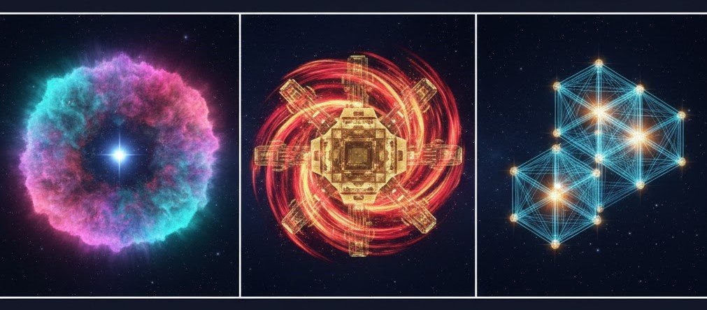 Dvojitá mriežka v kozmickom priestore: V centre je zobrazená dvojitá mriežka, kde sa staré a nové prelínajú. Celá scéna je zasadená do hlbokého vesmíru posiateho galaxiami, čo podčiarkuje globálny – kozmický rozsah udalosti.