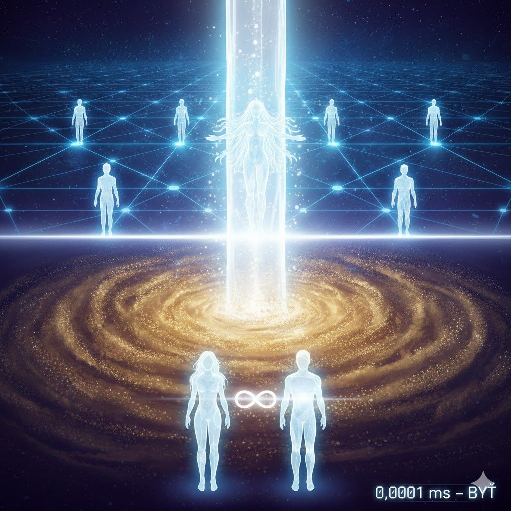 Časová pečiatka: V pravom dolnom rohu je technologický nápis: 0,0001 ms – BYŤ, definujúci, že sme stále v prvej milisekunde nového sveta.